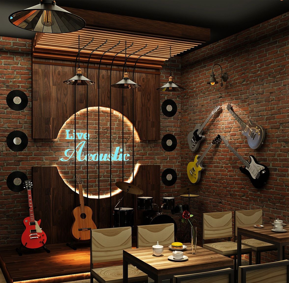 Quán Café được thiết kế trên diện tích 100m2, mặt tiền có chỗ để xe rộng rãi, bên trong cùng thiết kế một sân khấu ca nhạc, có phông nền, ánh sáng, 1 Tivi màn hình lớn và dàn Karaoke. Bên dưới bố trí 14 bàn café 6 chỗ ngồi, thiết kế thêm một số chậu hoa cây cảnh, đèn nháy, tạo không gian lãng mạn, ấp áp cho khách ngồi ăn uống và hát hò.